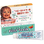 | 母乳やだ液にも含まれる天然酵素の働きに着目し、アメリカで開発されました。1989年に販売開始され、現在では世界約50カ国のお母さんたちに広く愛用されています。 [ 対象年齢 ] 生後5ヶ月〜4才くらい ○赤ちゃんのお口も守る母乳の天然の力 母乳には、抗菌酵素や免疫力を高める成分が含まれ、母乳で育った赤ちゃんは人工乳で育った赤ちゃんより感染症などの病気にかかりにくいといわれています。また、母乳に含まれる天然酵素は、抵抗力の未発達な赤ちゃんの身体だけではなく、お口の中も守ってくれています。 ○赤ちゃんのお口をやさしく守ります 1. 母乳やだ液にも含まれる天然酵素(*1) + ラクトフェリン(*2) 配合 [ラクトペルオキシダーゼ、塩化リゾチーム] 2. キシリトール(*3) 配合 3. 乳酸カルシウム(*4) 配合 *1 *2 清掃助剤 *3甘味剤 *4矯味剤 これらの成分が赤ちゃんの繊細な乳歯を虫歯から守ります。 ○赤ちゃんが大好きな味、ママも安心な成分 歯みがきが好きになるリンゴ&バナナ味。本物のフルーツを使用しています。 また、ファーストティースは、まだ「くちゅくちゅぺっ」ができない赤ちゃんのために開発された歯みがき剤なので、以下の成分が含まれていません。 発泡洗浄剤(ラウリル硫酸ナトリウム)/フッ素/研磨剤/サッカリン(人工甘味料)/パラベン(防腐剤)/人工色素/人工香料 注意:卵由来の成分(塩化リゾチーム)が微量含まれるため、卵アレルギーの既往歴やその可能性がある場合には、ご注意ください。 [ 使用方法 ] 少量(あずき大)を歯ブラシにつけて、小さな円を描くようにやさしく歯と歯ぐきをブラッシングしてください。※赤ちゃんのお口をやさしくブラッシングできるインファデント(赤ちゃん用指サック歯ブラシ)をあわせてお使いになることをおすすめします。