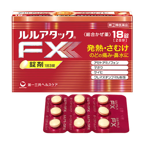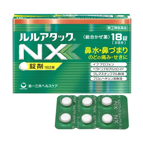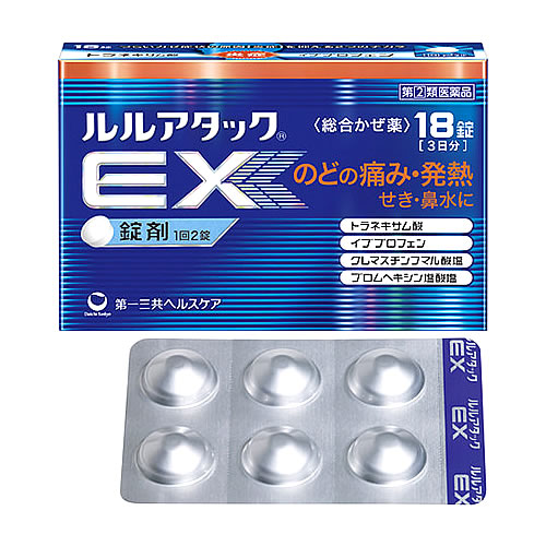 「ルルアタックEX」は、トラネキサム酸、イブプロフェン、クレマスチンフマル酸塩、ブロムヘキシン塩酸塩の4種類の基準外成分を配合した持ち運びに便利なアルミPTP包装の総合感冒薬です。