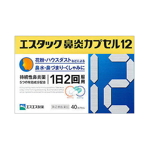 「エスタック鼻炎カプセル12」は、アレルギー性鼻炎症状に効果を発揮する成分4種と、頭重を和らげるカフェインの合計5つの有効成分を配合、鼻水・鼻づまりなどのアレルギー性鼻炎症状の緩和に優れた効果を発揮する持続性鼻炎薬です