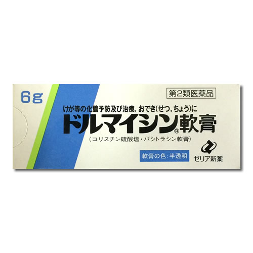 ドルマイシン軟膏は、硫酸コリスチンとパシトラシンの2種類の抗生物質を配合した化膿止めの軟膏です。 けが等の化膿予防・治療にすぐれた効果があります。