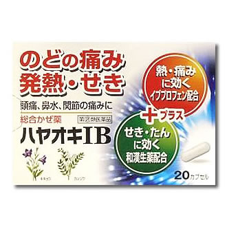 「ハヤオキIB」は解熱鎮痛成分イブプロフェンが「つらい熱・のどの痛み」をともなう“かぜ”にすぐれた効き目を発揮します。「ハヤオキIB」は,イブプロフェンをはじめ、和漢生薬のカンゾウ,キキョウを含む8種の成分がバランスよくはたらいて、せきやたん、鼻水、鼻づまりなど、かぜのいろいろな症状を緩和するかぜ薬です。