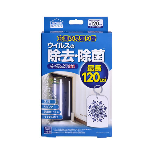 拡散した二酸化塩素が約6畳相当の空間に浮遊するウイルス、菌を除去します。5秒間駆動して30秒間停止を繰り返す間欠作動式で効率的に空間を除菌します。玄関の見張り番として玄関での使用をおすすめいたします。