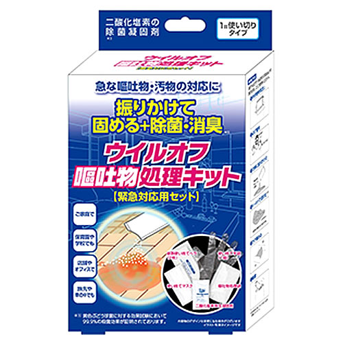 ウイルスを除去、徐菌、消臭する事ができ、嘔吐物を5~6分程で固形化させることができる処理キットです。
