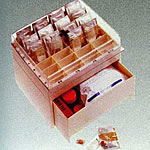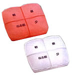 退院後の患者様がキチンとお薬を管理するための薬品収納箱です。1ケースに1日分の錠剤と散剤を入れておくことができます。抗菌樹脂仕様です。サイズは幅97mm×奥行91mm×高さ27mmです。色はご選択いただけません。