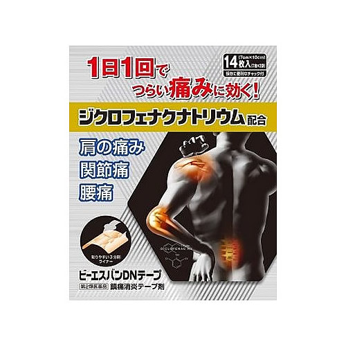 ビーエスバンDNはジクロフェナクナトリウムが主成分の関節痛、肩こりの痛み、腱鞘炎、肘の痛み、筋肉痛などの痛みの原因物質の生成を抑えるジクロフェナクナトリウムを配合しています。柔軟性のある基布を使用していますので粘着性に優れ、関節部にもフィットします。