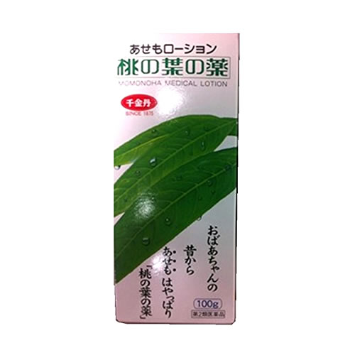 あせもローション 桃の葉の薬は、昭和24年に「桃の葉の行水療法」をヒントに開発された゛桃の葉とキョウニン゛を主成分とするさらっとさわやかな植物性の水生ローションです。