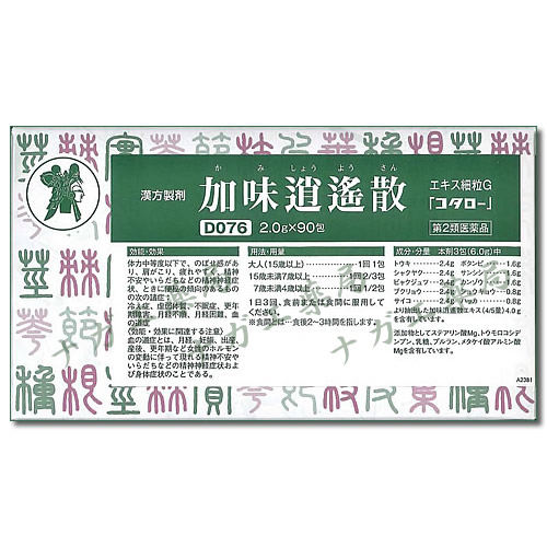 気持ちが落ち着かず、何となくイライラして心がゆれる状態を逍遥と呼び、春先や生理前などに起きやすい症状です。その逍遥の状態に著効を示す逍遥散に、牡丹皮と山梔子を加えた処方です。体力中等度以下の方の更年期障害、月経困難、月経不順、冷え症、不眠症等に用いられます。