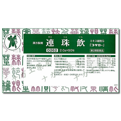 連珠飲は、苓桂朮甘湯と四物湯を合わせた処方で、その両者の薬効、すなわち水毒と血虚を改善します。古典によると「婦人の百病を改善する」といわれる処方です。めまい、立ち眩み、貧血、自汗、更年期における不定愁訴にとてもよく効きます。